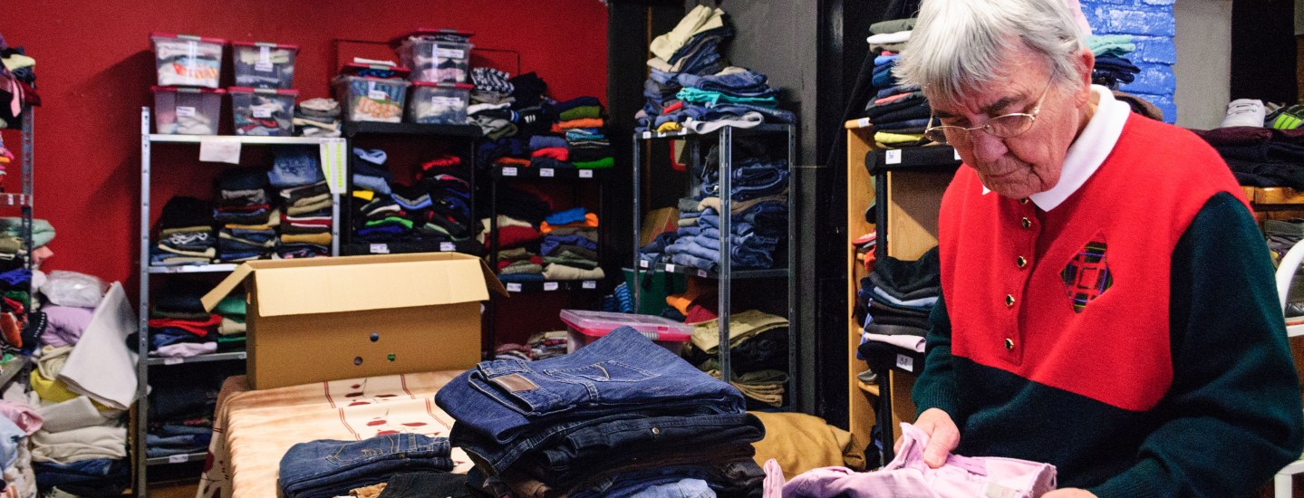 Drie omaatjes houden de boel hier dus draaiende. Ze krijgen hulp van andere vrijwilligers waaronder ook vluchtelingen zelf. Zo staan een Syrische man en een Duitse oma naast elkaar in een knusse kelder kleren te sorteren en plooien.