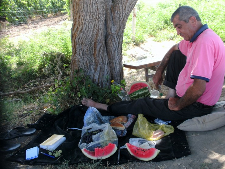 Ik wandel langs de rechterkant van de weg, wanneer ik plots links een oude man onder een boom zie zitten. Hij wenkt me. Voor we goed en wel hebben kennisgemaakt krijg ik al worst, kaas, brood, druiven en mierzoete watermeloen aangeboden. Varuzh draagt een roze hemd, een sjofele zwarte broek en is blootvoets. Al snel blijkt dat hij een uitermate vriendelijke grijsaard is, maar er schuilt mistroostigheid in zijn doffe blik. Op zijn zwart behaarde armen staan verschillende onduidelijke tattoos. Ter verklaring laat hij me een foto zien op zijn gsm: dezelfde man in een compleet andere context. Op het kleine scherm zie ik een bebaard persoon in camouflagepak met een mitraillette in zijn handen.